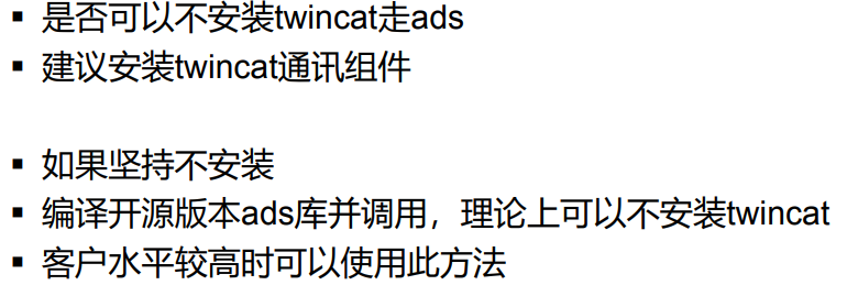 第二种就是官方说可以编译开源的 ADS 库(这也确保了可以在 linux 下实现 ADS,倍福自己开源的 https://github.com/Beckhoff/ADS)。下面放出 ADS Router 多机交互原理和官方对安不安装 TwinCAT 的建议。