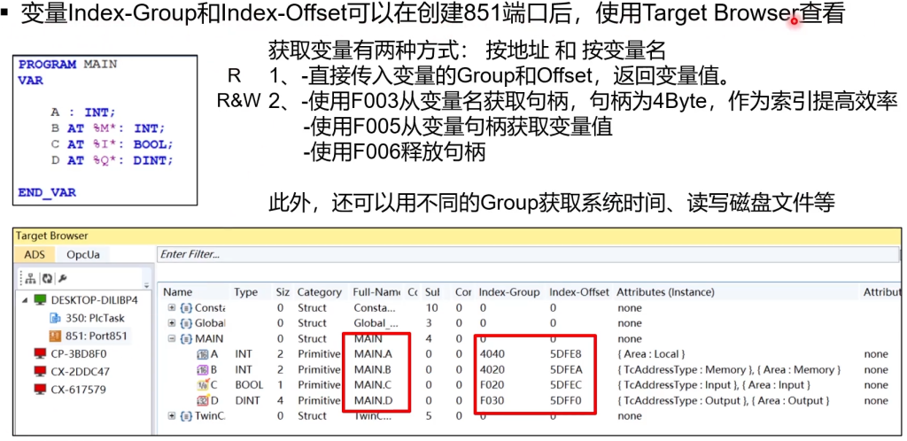 但是在外面程序中并不需要关心 Index-Group:F00x 的操作,只需要找到对应数据直接对应的 Index-Group 和 Index-Offset 或者变量名并创建或者释放对应句柄就行了,底层的 ADS 库会帮我们解决。
